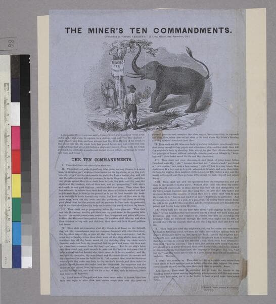 Image of eleven vignettes depicting The Miners' Ten Commandments and an elephant pointing with its trunk to a sign for Ten Commandment [sic] on a cabin. The commandments deal with mining practices, moral issues, and family matters. The vignettes surround the text at the center of the image which describes the commandments. "H. Eastman del."--text, below the first vignette. "Eastman. [Anthony & Baker]."--text, below tenth vignette. "Sun Print, San Francisco. Entered according to Act of Congress, in the year 1853, by James M. Hutchings, in the Clerk's Office of the U.S. District Court for the Northern District of California. Orders, pre paid, addressed "[Box H Placerville, El Dorado Co., Cal."]."--text, below image. Part of the right side of the image has been torn away on the right side. Paper color: blue.