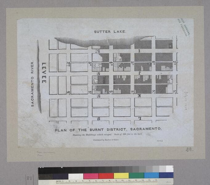 Plan of the Burnt District, Sacramento, Showing the Buildings which escaped