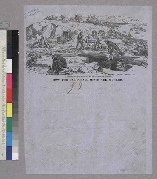 Image of miners within a wooden enclosure digging a trench, shoveling gravel into a sluice box, and lifting a large bolder with a pulley. The river and a cabin on a hill are in the background. "Anthony & Baker SC. Published at the Wide West Office, 184 Clay Street, San Francisco."--text, below image. Paper color: buff.