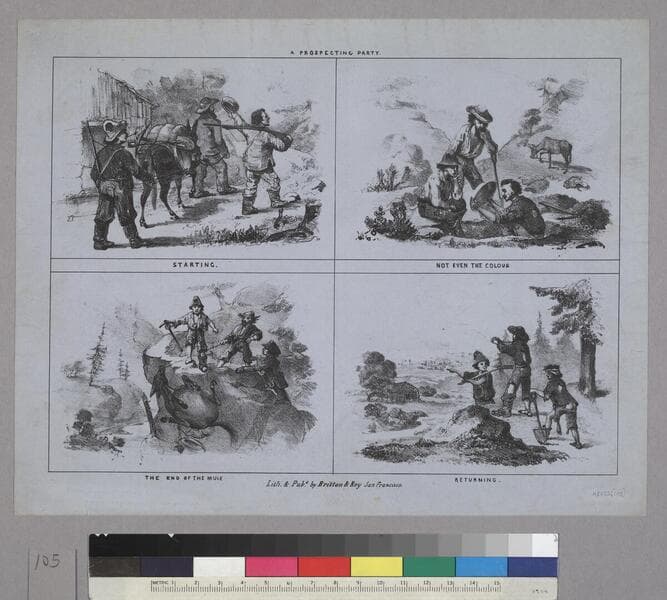 Image is of four vignettes which depict four common experiences in the life of a miner. The upper left vignette depicts two miners resting with their packs and a stream in the background. The upper right vignette depicts one miner with a pan of gold and the other jumping joyously. The lower left vignette depicts two discouraged miners looking into a large hole they have dug. The lower right vignette depicts two miners trudging toward a village in the distance. "Lith. & Published by Britton & Rey, corner of Montgomery & Commercial Sts. S.F."--text, below image. The number 9 is in the upper right corner, indicating that this image may be part of a series. Paper color: buff.