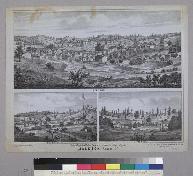 Scott & Brother were bankers in Yankee Jims'. "Britton & Rey print." "Drawn from nature & lithd by Kuchel & Dresel, San Francisco." At head of lithograph: Kuchel & Dresel's California views. Vignettes: 12 vignettes of homes and businesses. MS note: 183632. Prime meridian: GM. Projection: Birds-eye view. Printing Process: Lithography. Other Features: Vignettes.