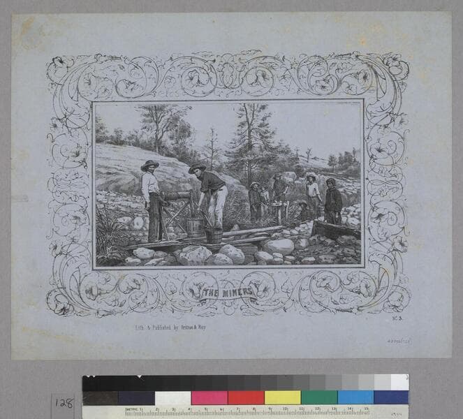 Center image is of miners pumping water into a flume and panning gold at the river's edge. The smaller images above and below the central image are of Sutter's Fort and Mokelumne Hill. There are two vignettes to the left and right of the central image that depict two miners in front of a tent by a fire and miners resting by a tree. "Lith. & Published by Britton & Rey corner Commercial & Montgomery Sts. S. Francisco. No. 4."--text, below image. Paper color: blue.
