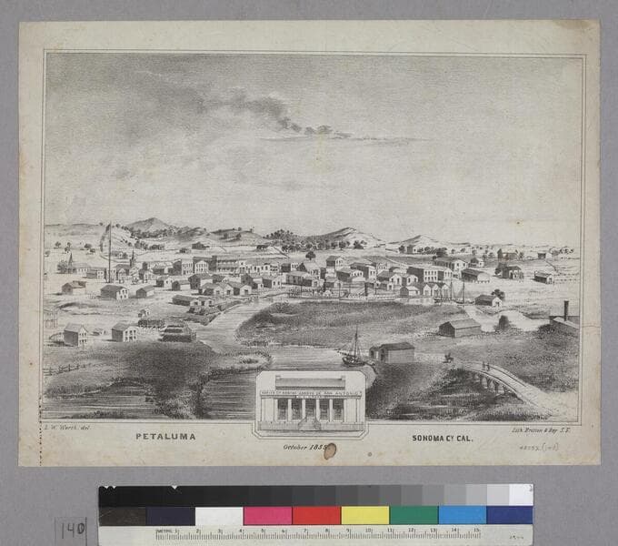 Image is of the town with scattered buildings at the right and in the center background. There are trees and rolling hills surrounding the town. A lumber mill is in the right foreground and a farm is to the left. "R.E. Ogib[by]y [sic: y over b; should be Ogilby] del. Lith. Britton & Rey San Francisco."--text, below image. Paper color: buff.