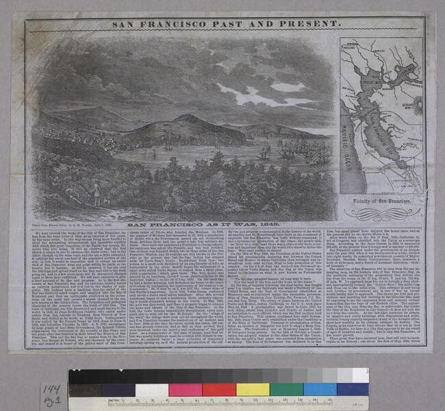 Image is of the general view from Nob Hill area looking east with Yerba Buena Island in the background. Two figures are standing on the hill in the foreground and an artist is sketching. Baird notes that although this image is apparently not the same stone, it is the same basic view as "San Francisco Upper California." "[Britton] & Rey Cor. Montgy. & Comml. Sts."--text, below image. "Noisy Carrier's Publishng [Hall]. 77 Long Wharf San Francisco. Charles P. Kimball Propretor [sic]."--stamped text, below image to the right. Paper color: gray.