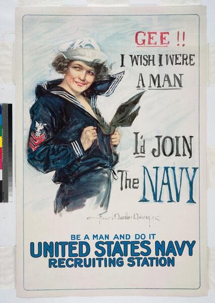 - Prints, advertising; Image of a young woman wearing a Navy uniform and white sailor cap, with her collar blowing up in the wind, on a United States Navy recruitment poster during World War I.