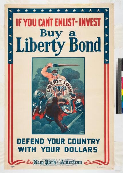 - Prints, advertising; Image of an allegorical bare-chested male warrior figure with a headband labeled "America" wielding a sword and shield emblazoned with an American eagle emblem and the words "Liberty Loan" in a fight against four attacking figures: one labeled "Devastation," a wolf labeled "Starvation," a man with a dagger labeled "War," a striking snake labeled "Pestilence," and a skeleton labeled "Death"; the poster promotes the sale of United States Liberty Bonds during World War I.