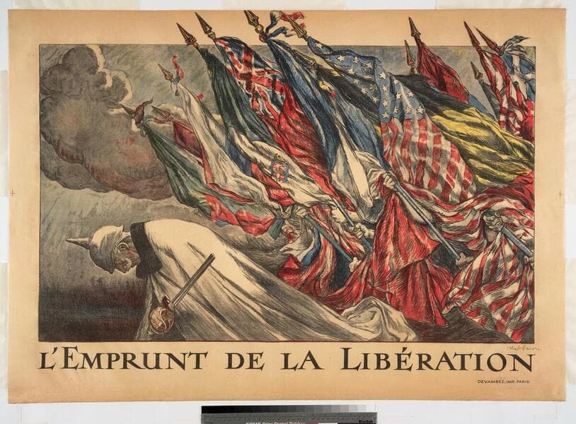 - Prints, advertising; Image of the defeated Kaiser Wilhelm II of Germany, wearing a white cape and military helmet and holding a broken sword, being herded by unidentified individuals carrying the flags of various countries including France, the United States, Great Britain, Belgium, and Japan; the poster promotes France's fourth war loan campaign in World War I.