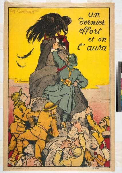 - Prints, advertising; Image of Allied soldiers in World War I climbing a rocky crag towards the German Imperial eagle that crouches at the peak with bloody claws above the Iron Cross; the lead soldier wears a French uniform, and soldiers in the combat uniforms of other countries, including two United States infantrymen, follow.