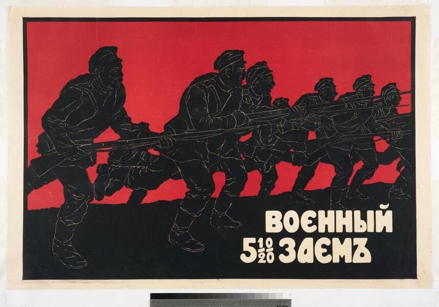 - Prints, advertising; Image of Russian soldiers advancing on foot with their rifles and bayonets pointed; the poster promotes the Russian war loan campaign during World War I.