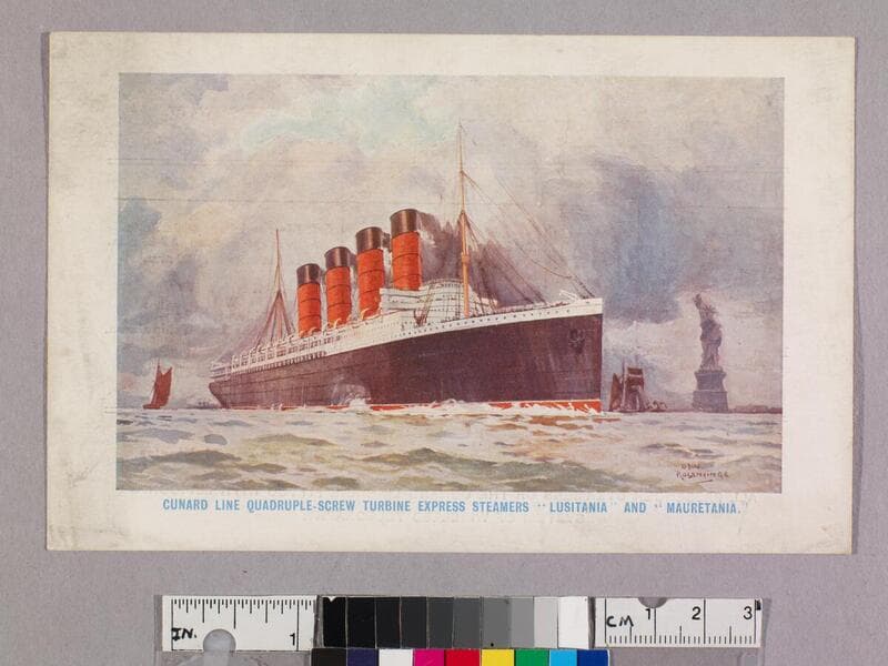 Promotional bochure describing the new Cunard vessels "Lusitania" and "Mauretania", including the power of the vessels, amenities and comparison of the size of the sisterships to famous landmarks such as Westminster, the United States Capitol and the Pyramids at Giza.
