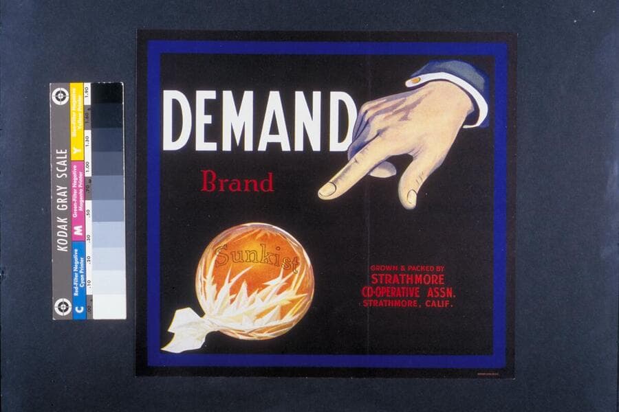 - Image of a hand pointing with index finger to wrapped orange Sunkist logo.