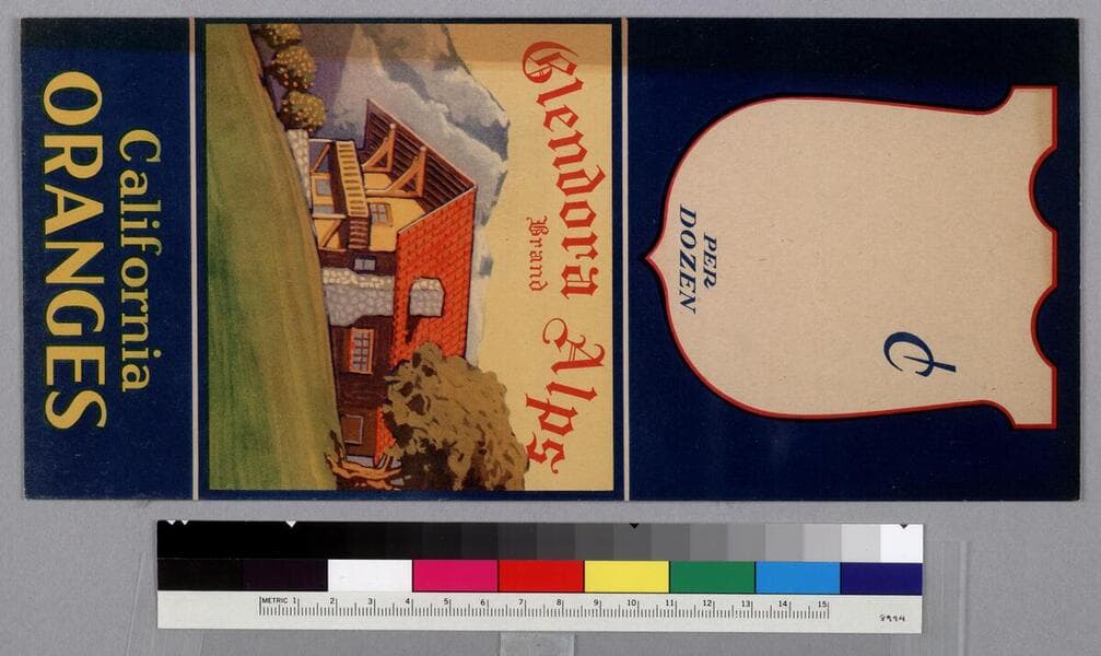 The Citrus label collection contains more than 1,500 lithographed labels related to the California citrus industry in the United States from 1880 to 1960, with the bulk of the collection dating from 1890 to 1940. The vast majority of the collection consists of lithographed labels produced for Californian growers, packers, and distributors to identify brand names and packing locations on wooden shipping crates of oranges, lemons and grapefruits. Many of the labels were printed by Los Angeles and San Francisco lithographers. The collection includes a range of lithography techniques from crayon drawing and hand stippling to the use of Ben Day screen patterns and half-tone lithography. The collection also includes more than 100 examples with "bronzing," a printing technique where varnish is printed on the label, followed by a dusting of fine bronze powder. A significant number of labels are stamped on verso with a received date by the Fruit Growers Supply Company, and some include signatures of approval or notations about printing corrections. The collection provides a broad view of the development of citrus fruit advertising over time, and also touches upon topics of commerce, manufacturing, travel and tourism, and promotion of the western United States. In the earliest examples, themes include naturalistic designs of flowers, animals, women, historical subjects, and scenic landscapes. Brand names, simple designs, block letters, and geometric patterns dominate in later examples. Many of the labels depict orange groves, scenic views, or flowers, though the collection also includes a wide variety of imagery beyond these themes including Native Americans, transportation, children, and portraits of famous or fictional people.
