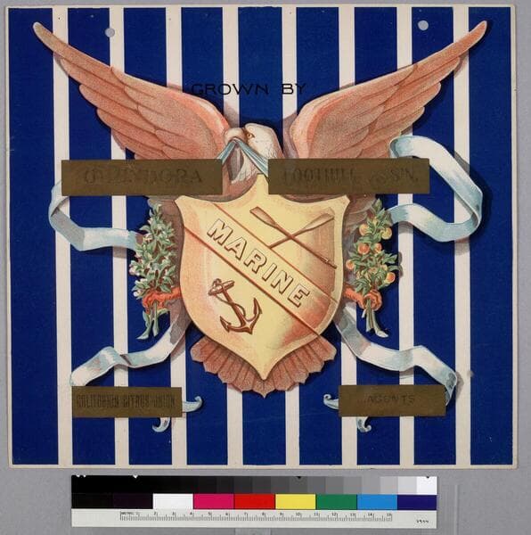 - Image of a shield with bald eagle whose wings are outstretched with lettered banner in beak and orange tree branches with flowers and fruit in talons; oars and an anchor on shield; blue and white striped background.