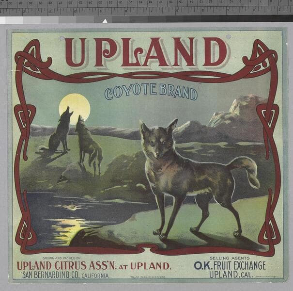 - Image of a coyote in foreground; two coyotes howling at the moon near a body of water and mountains in background.