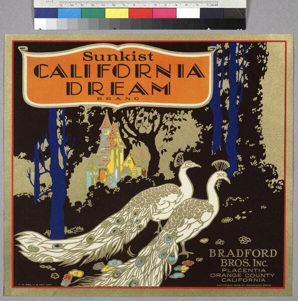 Image of a mission, orange grove and palm trees with mountains in background in a stylized rectangle panel; orange cluster with leaves at left.