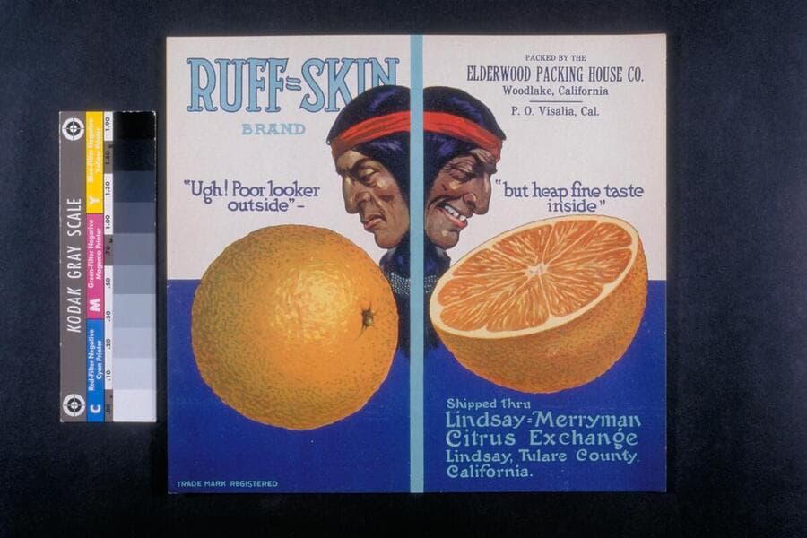 The Citrus label collection contains more than 1,500 lithographed labels related to the California citrus industry in the United States from 1880 to 1960, with the bulk of the collection dating from 1890 to 1940. The vast majority of the collection consists of lithographed labels produced for Californian growers, packers, and distributors to identify brand names and packing locations on wooden shipping crates of oranges, lemons and grapefruits. Many of the labels were printed by Los Angeles and San Francisco lithographers. The collection includes a range of lithography techniques from crayon drawing and hand stippling to the use of Ben Day screen patterns and half-tone lithography. The collection also includes more than 100 examples with "bronzing," a printing technique where varnish is printed on the label, followed by a dusting of fine bronze powder. A significant number of labels are stamped on verso with a received date by the Fruit Growers Supply Company, and some include signatures of approval or notations about printing corrections. The collection provides a broad view of the development of citrus fruit advertising over time, and also touches upon topics of commerce, manufacturing, travel and tourism, and promotion of the western United States. In the earliest examples, themes include naturalistic designs of flowers, animals, women, historical subjects, and scenic landscapes. Brand names, simple designs, block letters, and geometric patterns dominate in later examples. Many of the labels depict orange groves, scenic views, or flowers, though the collection also includes a wide variety of imagery beyond these themes including Native Americans, transportation, children, and portraits of famous or fictional people.