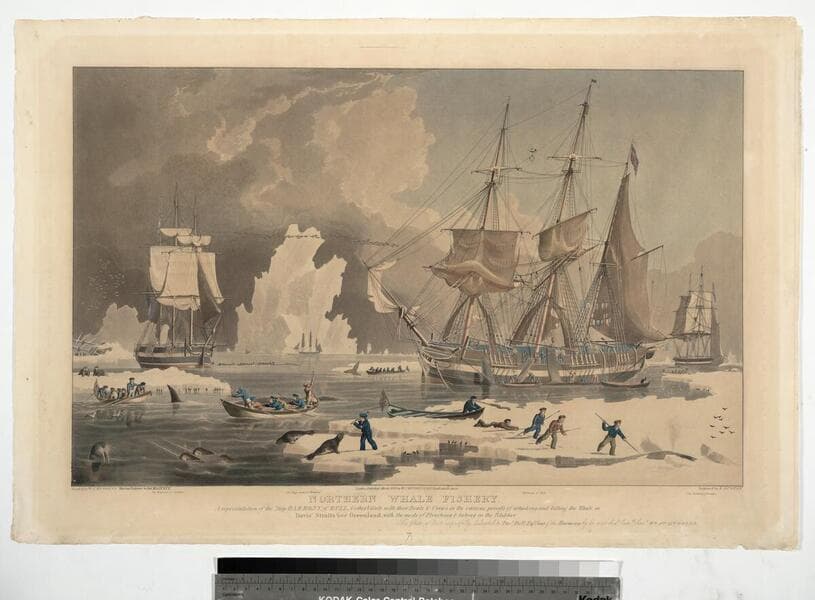 Northern Whale Fishery. A representation of the ship Harmony of Hull, & other vessels with their boats & crews in the various process of attacking and killing the whale in Davis Straits and Greenland, with the mode of flinching & taking in the blubber