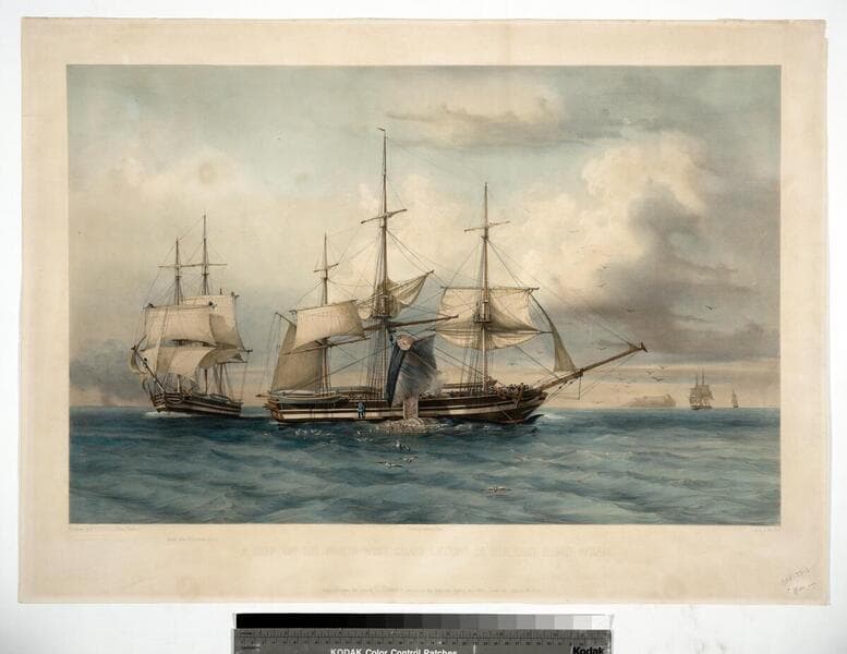 ![South Sea Whale Fishery. A representation of the ships Amelia Wilson & Castor off the Isle of Bouro, with their boats & crew in the various process of fishing, showing the manner the spermacetti [sic] whales are caught, also the mode of cutting them into the ship, & boiling the oil upon deck](/_next/image?url=https%3A%2F%2Frail.huntington.org%2FIIIF3%2FImage%2F22APN4UCXRH6%2Ffull%2F%5E360%2C%2F0%2Fdefault.jpg&w=750&q=75)