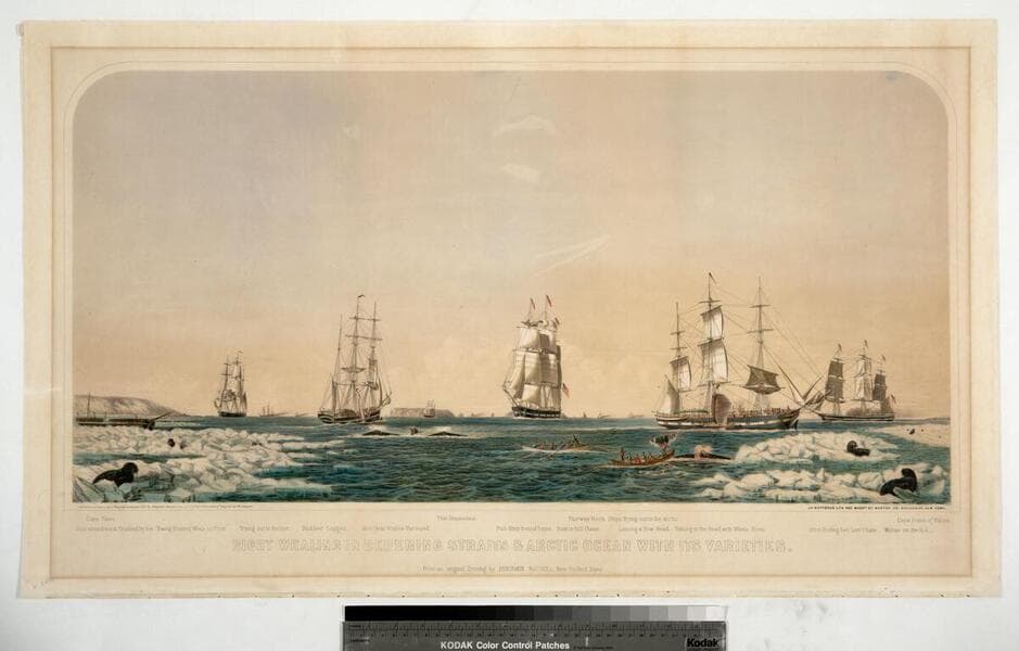 ![South Sea Whale Fishery. A representation of the ships Amelia Wilson & Castor off the Isle of Bouro, with their boats & crew in the various process of fishing, showing the manner the spermacetti [sic] whales are caught, also the mode of cutting them into the ship, & boiling the oil upon deck](/_next/image?url=https%3A%2F%2Frail.huntington.org%2FIIIF3%2FImage%2F22APN4UCXRH6%2Ffull%2F%5E360%2C%2F0%2Fdefault.jpg&w=750&q=75)