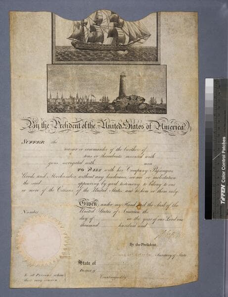 Image of a lighthouse on a rocky promontory with ships sailing nearby and image of a ship at sea at the top of a letter of safe conduct certificate for the ship Franklin of New Bedford, Massachusetts, granting the ability to pass without "hindrance, seizure, or molestation;" embossed United States seal at bottom left; signed by President John Tyler and Secretary of State Daniel Webster.