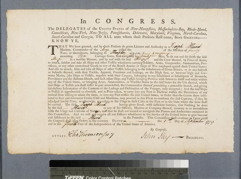 Image of a letter of marque certificate signed by President John Adams and Secretary of State Timothy Pickering authorizing captain Stephen Webb of the ship America to seize any armed French vessel found within the judicial limits of the United States; embossed United States seal at bottom left.