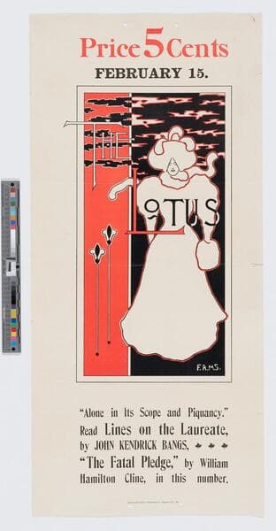 Image of an advertisement for Harper's magazine July 1896 issue featuring a woman wearing a floral hat and a dress with puffed sleeves holding a closed umbrella in both hands.