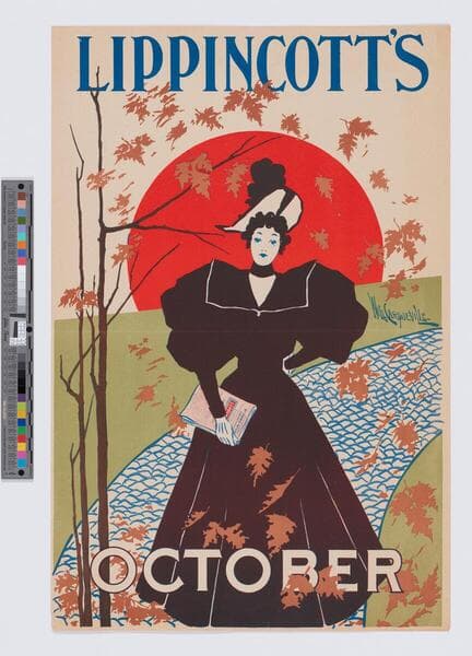 Image of an advertisement for Lippincott's magazine September 1896 issue; a woman wearing a dress with puffed sleeves sits at a table with a copy of Lippincott's resting in front of her.