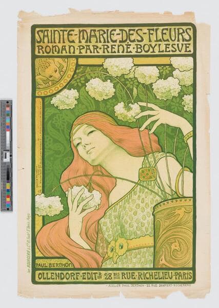 - Image of an advertisement for the novel Sainte Marie des Fleurs by Rene Boylesve featuring a woman touching stems of white hydrangea flowers arranged in a vase.