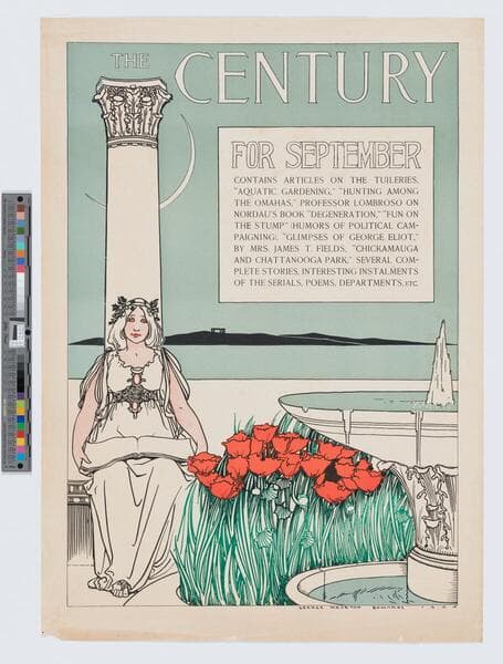 Image of an advertisement for the Century magazine May 1895 issue; two women in flowing robes and winged sandals dance past a sundial holding a flower garland upraised.