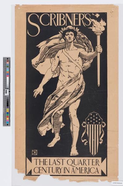 - Image of an advertisement for Scribner's magazine; mostly nude male figure wearing a laurel wreath and billowing fabric head covering holds a large torch aloft; shield printed with stars and stripes at bottom right.