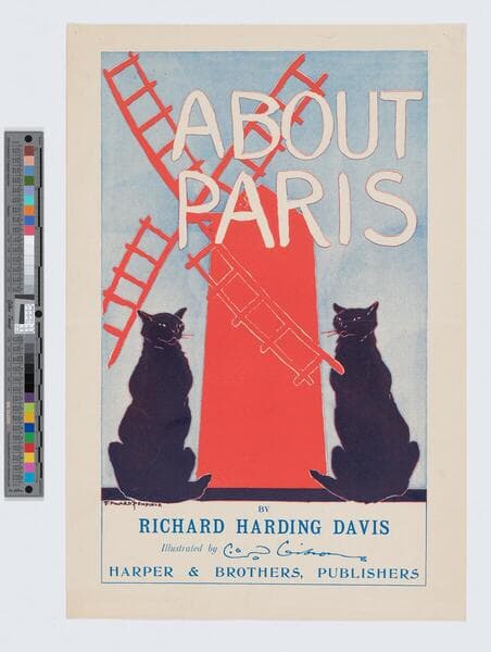 Image of an advertisement for About Paris by Richard Harding Davis featuring a pair of black cats sitting in front of a red windmill.