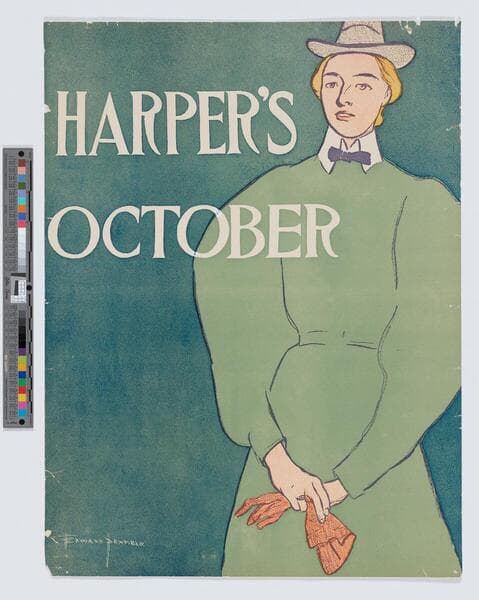 Image of an advertisement for Harper's magazine October 1896 issue featuring a three-quarter length portrait of a woman wearing a hat and holding a pair of gloves.