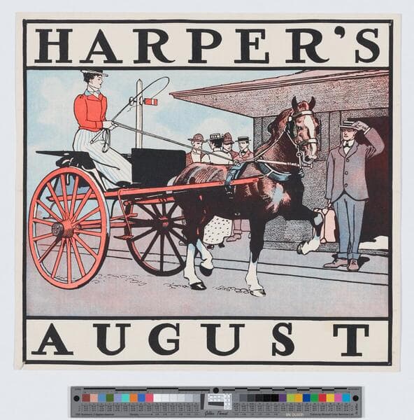 Image of an advertisement for Harper's magazine September 1897 issue featuring a man and a woman riding in a horse-drawn cart; the woman holds the reins and a whip.