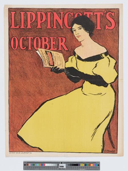 Image of an advertisement for Lippincott's magazine September 1896 issue; a woman wearing a dress with puffed sleeves sits at a table with a copy of Lippincott's resting in front of her.