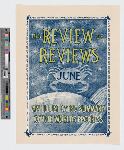 - Image of an advertisement for the Review of Reviews June 1895 issue featuring the crab constellation Cancer amidst other stars shining above a planet with continents and rings; decorative border made up of crabs and Cancer zodiac symbols.
