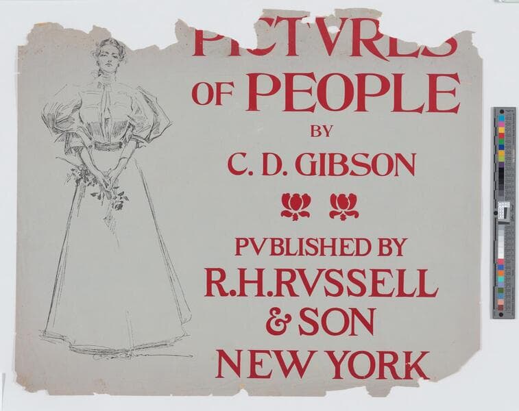 Image of an advertisement for Soldiers of Fortune by Richard Harding Davis; full-length sketch of a woman wearing a skirt and a blouse with puffed sleeves holding a hand outstretched.