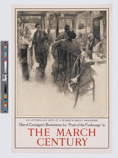 Image of an advertisement for the Century magazine March 1900 issue; interior view of a busy bar and restaurant in Paris, France, with people seated around a table eating and drinking, and a man standing at the bar talking to another man seated at a table.