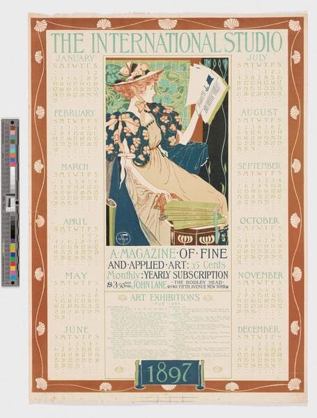 Image of an advertisement for the Inland Printer magazine November 1897 issue; woman in flowing dress sits on a bench reading the Inland Printer; foliage in background.