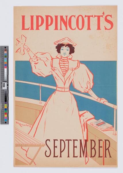 Image of an advertisement for Lippincott's magazine September 1896 issue; a woman wearing a dress with puffed sleeves sits at a table with a copy of Lippincott's resting in front of her.