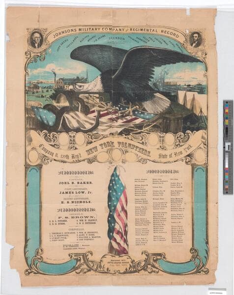 Image of a military register for Troop B of the 1st Regiment of the New York Mounted Rifles during the American Civil War; vignettes featuring the goddess Columbia with sword and shield upheld by the Constitution, the United States Capitol, American flags, American bald eagles, cherubs, columns, women, and soldiers with their families; names of company officers and soldiers at center, including lists of those who deserted, died, or were discharged, transferred, or killed in action.