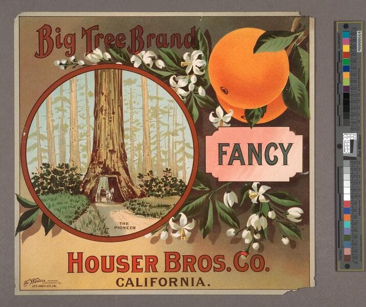 The Citrus label collection contains more than 1,500 lithographed labels related to the California citrus industry in the United States from 1880 to 1960, with the bulk of the collection dating from 1890 to 1940. The vast majority of the collection consists of lithographed labels produced for Californian growers, packers, and distributors to identify brand names and packing locations on wooden shipping crates of oranges, lemons and grapefruits. Many of the labels were printed by Los Angeles and San Francisco lithographers. The collection includes a range of lithography techniques from crayon drawing and hand stippling to the use of Ben Day screen patterns and half-tone lithography. The collection also includes more than 100 examples with "bronzing," a printing technique where varnish is printed on the label, followed by a dusting of fine bronze powder. A significant number of labels are stamped on verso with a received date by the Fruit Growers Supply Company, and some include signatures of approval or notations about printing corrections. The collection provides a broad view of the development of citrus fruit advertising over time, and also touches upon topics of commerce, manufacturing, travel and tourism, and promotion of the western United States. In the earliest examples, themes include naturalistic designs of flowers, animals, women, historical subjects, and scenic landscapes. Brand names, simple designs, block letters, and geometric patterns dominate in later examples. Many of the labels depict orange groves, scenic views, or flowers, though the collection also includes a wide variety of imagery beyond these themes including Native Americans, transportation, children, and portraits of famous or fictional people.