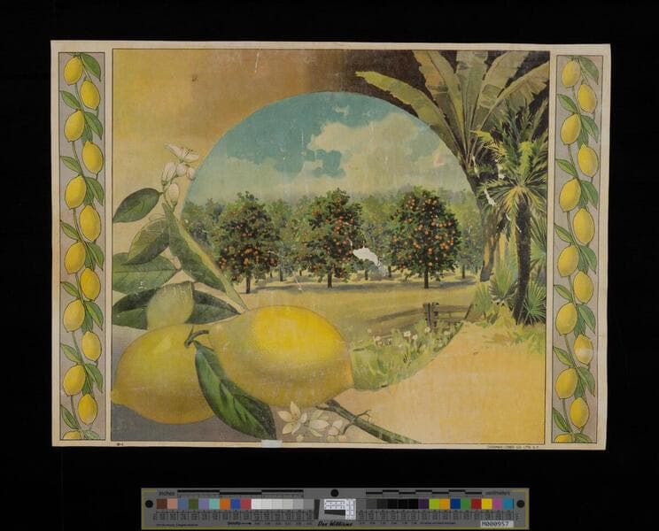 The Citrus label collection contains more than 1,500 lithographed labels related to the California citrus industry in the United States from 1880 to 1960, with the bulk of the collection dating from 1890 to 1940. The vast majority of the collection consists of lithographed labels produced for Californian growers, packers, and distributors to identify brand names and packing locations on wooden shipping crates of oranges, lemons and grapefruits. Many of the labels were printed by Los Angeles and San Francisco lithographers. The collection includes a range of lithography techniques from crayon drawing and hand stippling to the use of Ben Day screen patterns and half-tone lithography. The collection also includes more than 100 examples with "bronzing," a printing technique where varnish is printed on the label, followed by a dusting of fine bronze powder. A significant number of labels are stamped on verso with a received date by the Fruit Growers Supply Company, and some include signatures of approval or notations about printing corrections. The collection provides a broad view of the development of citrus fruit advertising over time, and also touches upon topics of commerce, manufacturing, travel and tourism, and promotion of the western United States. In the earliest examples, themes include naturalistic designs of flowers, animals, women, historical subjects, and scenic landscapes. Brand names, simple designs, block letters, and geometric patterns dominate in later examples. Many of the labels depict orange groves, scenic views, or flowers, though the collection also includes a wide variety of imagery beyond these themes including Native Americans, transportation, children, and portraits of famous or fictional people.