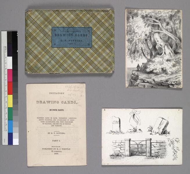 One set of drawing cards entitled Initiatory Drawing Cards, Part I, by B.F. Nutting, printed by M. J. Whipple, Boston, Massachusetts, 1848. The set of eighteen cards is complete. Each is described in an eight page instructional pamphlet included with the cards, entitled Initiatory Drawing Cards, In Four Parts, with the subtitle Eighteen Cards in Each, Presenting Carefully Drawn Examples, and Accompanied by Directions Illustrating the First Principles of Drawing; for the Use of Schools and Families. The pamphlet describes each of the cards in the set, the number in the pamphlet corresponds to the card's number in the upper right-hand corner. Instructions are given in basic drawing techniques. The original envelope in which the cards and pamphlet were enclosed is also included. On the inside of the envelope, in pencil, is the following note: "See Dreppard for long [note?] p.16/ Part I complete/ Parts II (12) & IV (11) incomplete/ Lot as is/ Rare (NYPL has Part II only.)/ 40-." Written in ms., in the upper right-hand corner of the pamphlet's cover, is "40-." (price).