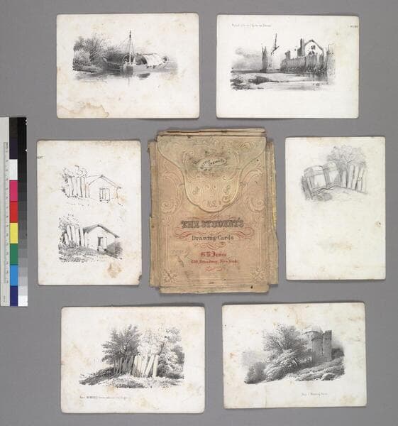 One set of drawing cards, in a blue and white patterned-paper envelope entitled Coe’s New Drawing Cards for Schools, No. 5, printed by D. Appleton & Co., New York, ca. 1860-1880. The envelope label also includes the note "Instructions for the Series will be found with No. 1" and the statement "(Copyright Secured.)". The 17 drawing cards depict landscapes, architecture and animals. Each of the cards have a "No. 6" in the upper left hand corner, and sometimes a number in the upper right hand corner.