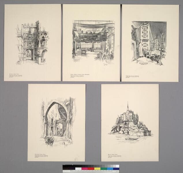 Six advertisements entitled The Eldorado Page, Sketching with "the master drawing pencil," published by Joseph Dixon Crucible Co., Jersey City, New Jersey, ca. 1920-1940. These 6 sheets are promotional advertisements for Dixon pencils and feature aspects of pencil-drawing technique. Sheet No. 1 is "Area Technique"; No. 2 is "A Discussion of the Center of the Sketch"; No. 3 is "Notation of Procedure"; No. 4 is "Exercises"; No. 5 is "How to Sketch Evergreen Foliage"; and No. 6 is "The White Door". All of the illustrations and instructional text are by Ernest W. Watson, who was an instructor at the Pratt Institute. The six pages were originally published in various issues of an unnamed magazine.
