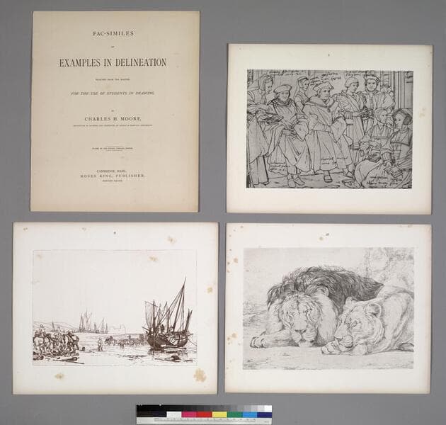 One boxed set of 16 art reproductions (and one duplicate) selected from the Masters, for the use of students in Drawing, Moses King, Publisher, Cambridge, Massachusetts, with an accompanying pamphlet. The images were selected and described by Charles H. Moore, "Instructor in Drawing and Principals of Design in Harvard University", with plates by the Forbes Company of Boston and include reproductions of Durer, Holbein, Da Vinci, Ruskin, Turner and Rout.