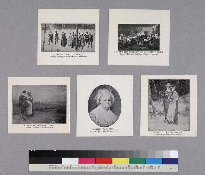 Three price lists: one (and its duplicate) for art reproductions by the George P. Brown & Co., Beverly, Massachusetts, ca. 1924. They are entitled Brown's Famous Pictures for February, March and April and Brown's Famous Bible Pictures. The former was issued as a double-sided single sheet; the latter as a 6-page price list. All three items were laid in a Brown & Co. Catalog, HEH RB #603406. The two single-sheet price lists are illustrated with a single row of images across each side of the leaf. Below the title and images reproduction cards are listed for sale and grouped by categories, for example: Washington Pictures, Dickens Pictures, Lincoln Picture; Thanksgiving and Christmas Pictures. Brown's Famous Bible Pictures is illustrated with a single image on the first page. This publisher's price list also groups images by category: 'The Life of Christ'; 'Old Testament Pictures'; 'Christmas Pictures'; 'Easter Pictures'; 'Madonnas'; 'Miniature Bible Pictures'. An ink stamp indicated a price change. "May 1924" is written in ms., in pencil, on the first page of this list.