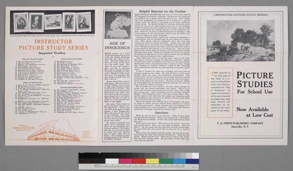 One publisher's advertisement entitled The University Prints Special 1917 Announcement: A New System of Picture Study for the Grades, published by The University Prints, Newton, Massachusetts, 1917. This item is a single sheet folded once to create a 4-page leaflet. Illustrated with examples from the Picture Study Program, this advertisement promotes The University Prints' method of teaching art development to children. The interior two pages of this leaflet organize the series of grouped images by grade level. For example: "List II - Grade I. Animals about the Home; Grade II. Children of Other Lands; Grade III. Angels; Grade IV. Occupations; Grade V. The Seasons; Grade VI. Interiors and Furnishings; Grade VII. Interesting Costumes; Grade VIII. Mural Decorations of the Congressional Library." Titles of ten different art works are listed within each category.