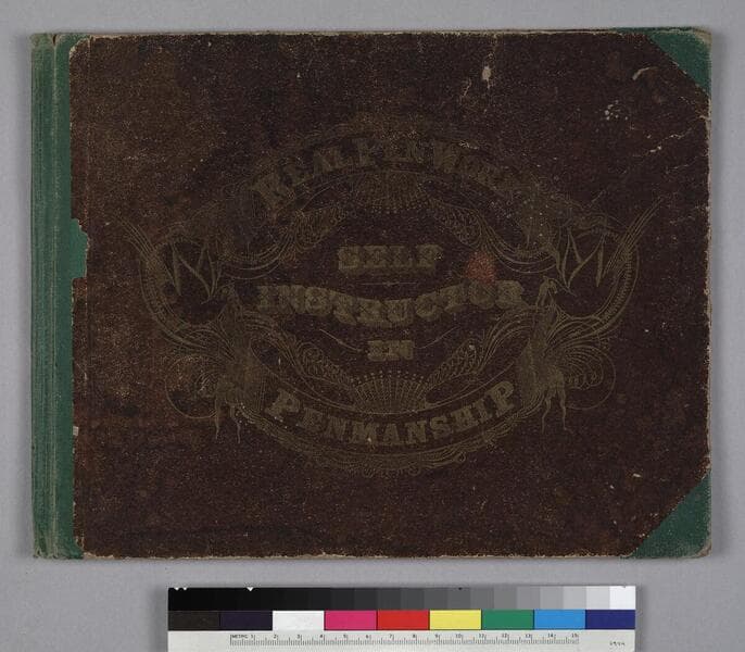 One penmanship book entitled Harper's Writing Books: Symmetrical Penmanship with Marginal Drawing Lessons, for Schools and Families, published by Harper & Brothers, New York, 1868. The subtitle reads: School and Family Series: Writing and Drawing, In Ten Numbers, Number 5. This penmanship practice book is 24 pages in length. Across the top of each page are the letters, phrases or sentences which are to be copied in the lined spaces below. Along the outer vertical margin of each page is a shaded block of figures and drawing exercises to be copied. On the front cover, the title surrounds several images and vignettes of people writing and drawing. The centered vignette shows three students seated at a table, writing. Instructional text, including specific directions for Book 5, are printed on the inside of the front cover, and continue on to the inside of the back cover. The back cover also features instructions for using and copying the additional exercises found in the margins of the book. None of the exercises have been completed.