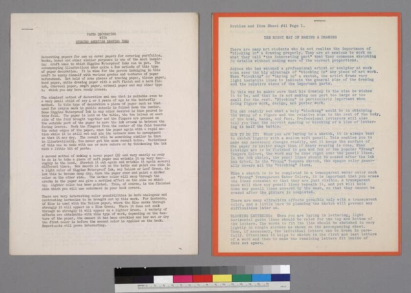 One flyer entitled Arts and Crafts Instruction and Design Books Series, published by Educational Materials, Inc., New York, ca. 1930. This 6-page leaflet is a publisher's advertisement for 3 individual titles and a series of "individual instruction sheets". The titles are: Craftsman's Instruction Handbook; A Handbook of Designs and How to Use Them; and Permodello Modeling (the item is not addressed). Included is an order form. This leaflet is a single sheet, folded into thirds. The dimensions provided are for the folded leaflet.